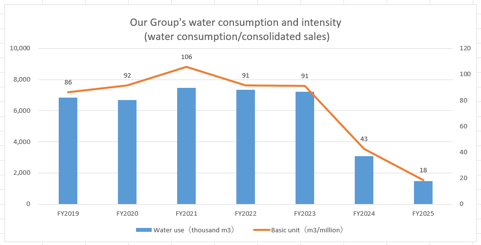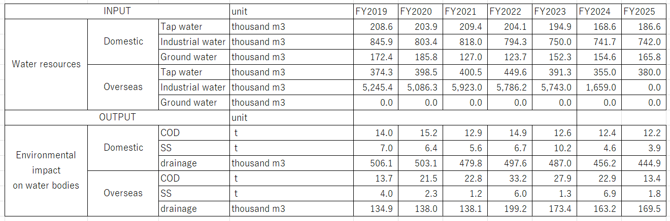 Water is an important resource for our group's business activities and local communities. We understand the amount of water resources used at each production site in Japan and overseas, the quality of water at the time of drainage, etc., and not only devise ways to use it internally and manage wastewater appropriately, but also contribute to the supply chain by using our products. In addition to working to reduce our environmental impact, we also conduct risk assessments to ensure sustainable business growth.