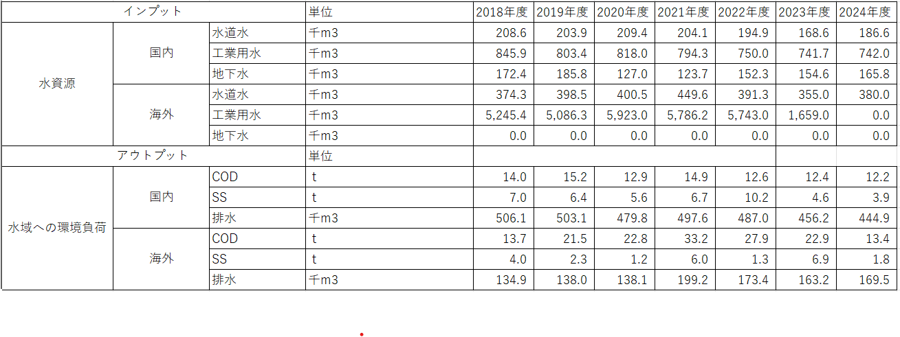 国内外の事業所別にリスクアセスメント評価も毎年実施しており、水リスクもさまざまなリスクのうちの一つとして認識しておりますが、当社グループ内での削減目標などの設定は特にしておりません。それ以上に当社の製品を使用いただくことで、サプライチェーンを通じて排水負荷の低減につながることを機会として捉え、事業活動に取り組んでおります。